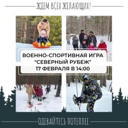 В преддверии празднования Дня защитника Отечества к нам в гости приезжает ДМЦ «Североморец» с программой военно-спортивной игры «Северный рубеж». Дата: 17 февраля Время сбора: 14:00 Место сбора: Рекреация 1 этажа школы Участники: Все желающие